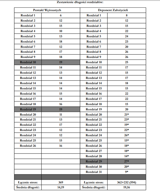 Powieść “Harry Potter i Deponent Założycieli” swoją grubością plasuje się więc pomiędzy “Więźniem Azkabanu” (464 strony) a “Czarą Ognia” (765 stron). Na całość składa się trzydzieści jeden rozdziałów. Średnia, przeciętna długość rozdziałów to nieco ponad 19 stron tekstu. Co ciekawe, tyle stron w “Pentaklu Wężoustych” liczą tylko dwa najdłuższe rozdziały. Z resztą zobaczcie sami: