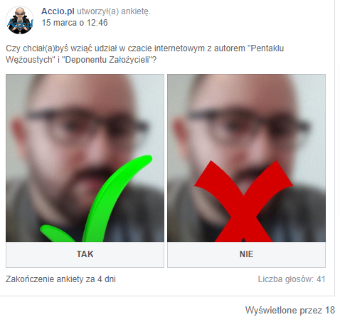 Głosowanie w ankiecie potrwa do 21 marca. Zachęcam Was do wzięcia udziału. Od jej końcowego wyniku zależy, czy spotkanie na czacie w ogóle się odbędzie 🙂