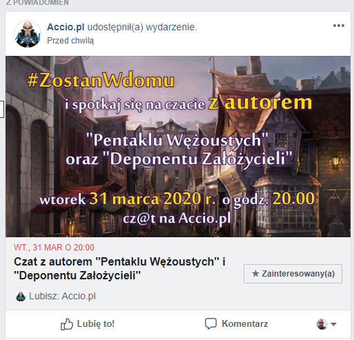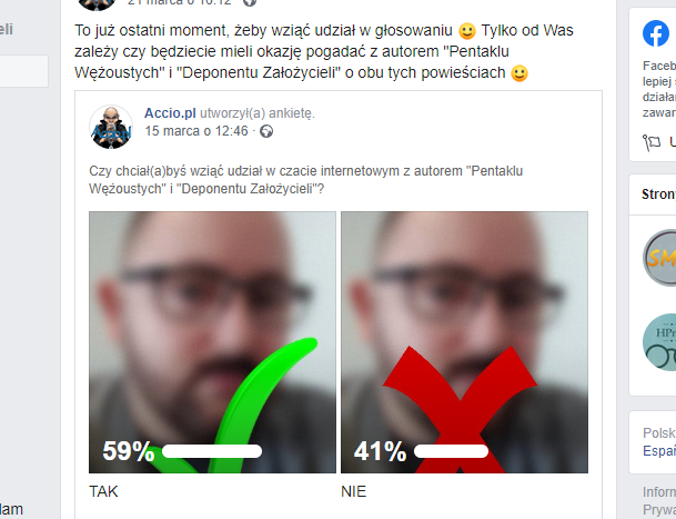 Jakiś czas temu na łamach naszego fb prowadziliśmy ankietę, w której zadaliśmy Wam następujące pytanie: “Czy chciał(a)byś wziąć udział w czacie internetowym z autorem “Pentaklu Wężoustych” i “Deponentu Założycieli”?” Głosowanie zakończyło się kilka dni temu, a wyniki prezentują się następująco: